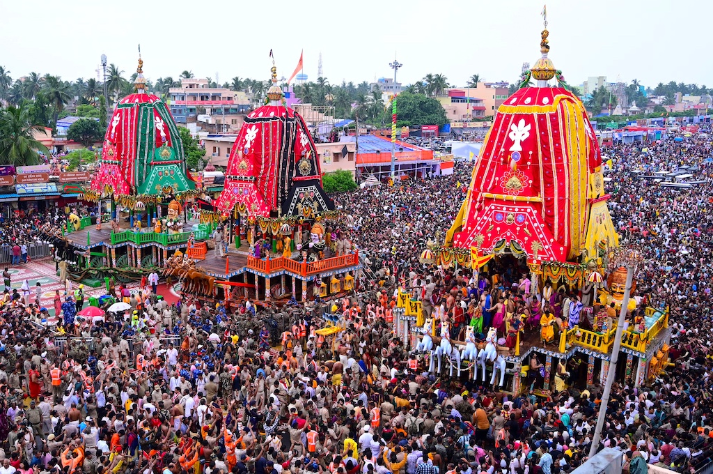 El Rath Yatra (Festival de los Carros) es una importante celebración hindú que reúne a millones de personas. Las deidades Jagannath (Krishna), Balabhadra y Subhadra son trasladadas en procesión sobre estos grandes carros, donde las personas tiran de las cuerdas de los carros para obtener bendiciones.