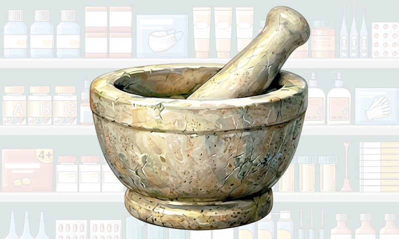 El mortero es un instrumento clásico del boticario, utilizado para moler y mezclar ingredientes en la elaboración de medicamentos. Desde 1759, su uso se popularizó en Escocia y Europa central, y sigue siendo un símbolo que identifica la farmacia como un establecimiento profesional dedicado a la preparación cuidadosa y magistral de fármacos. Representa la precisión, la técnica y el compromiso con la calidad en la práctica farmacéutica.