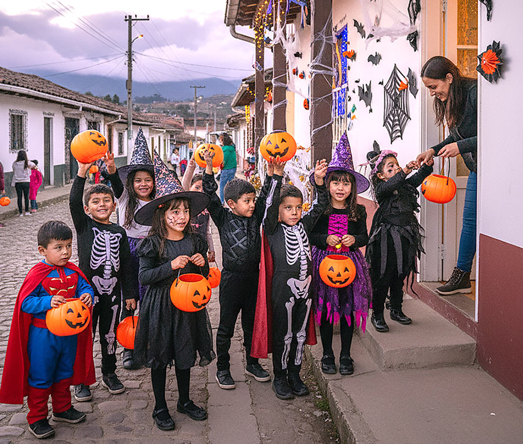 ¡Niños felices y saludables disfrutando Halloween al aire libre! Con defensas fuertes y piel cuidada, la diversión está asegurada.